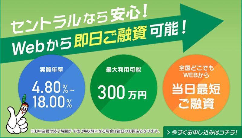 「セントラル」は45年以上の歴史を誇る老舗業者ながら企業努力を怠らず、サービス内容は大手消費者金融と引けをとりません。例えば、セントラルでは「 WEB申込24時間受付」「即日融資可能」「セブン銀行との提携」など、申込から借入、返済までをスピーディーに完了できる点がメリットとして挙げられます。